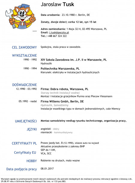 W życiorysie (CV, Lebenslauf) proszę umieścić następujące informacje: